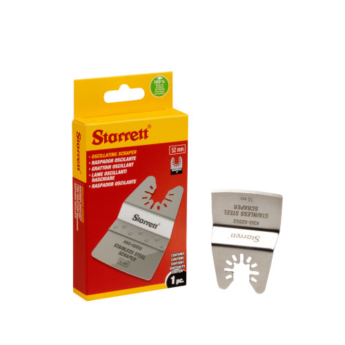 Starrett Stainless Steel Oscillating Scraper Blade designed to loosen adhesives, coatings or stuck-on materials, providing controlled removal without gouging the underlying surface. The stainless steel body resists rust and oxidation, making it ideal for use in damp or humid environments such as bathrooms, kitchens and outdoor work. This extends the blade lifespan when exposed to adhesives, caulk or moisture. Effective on soft adhesives (glue, caulk, silicone), removes paint, varnish or flooring adhesives, can lift carpet, vinyl or linoleum from subfloors, and removes decorative layers from walls in plaster or textured finishes. Universal fitment compatible with most popular brands of multi-tool machine (not compatible with Starlock).